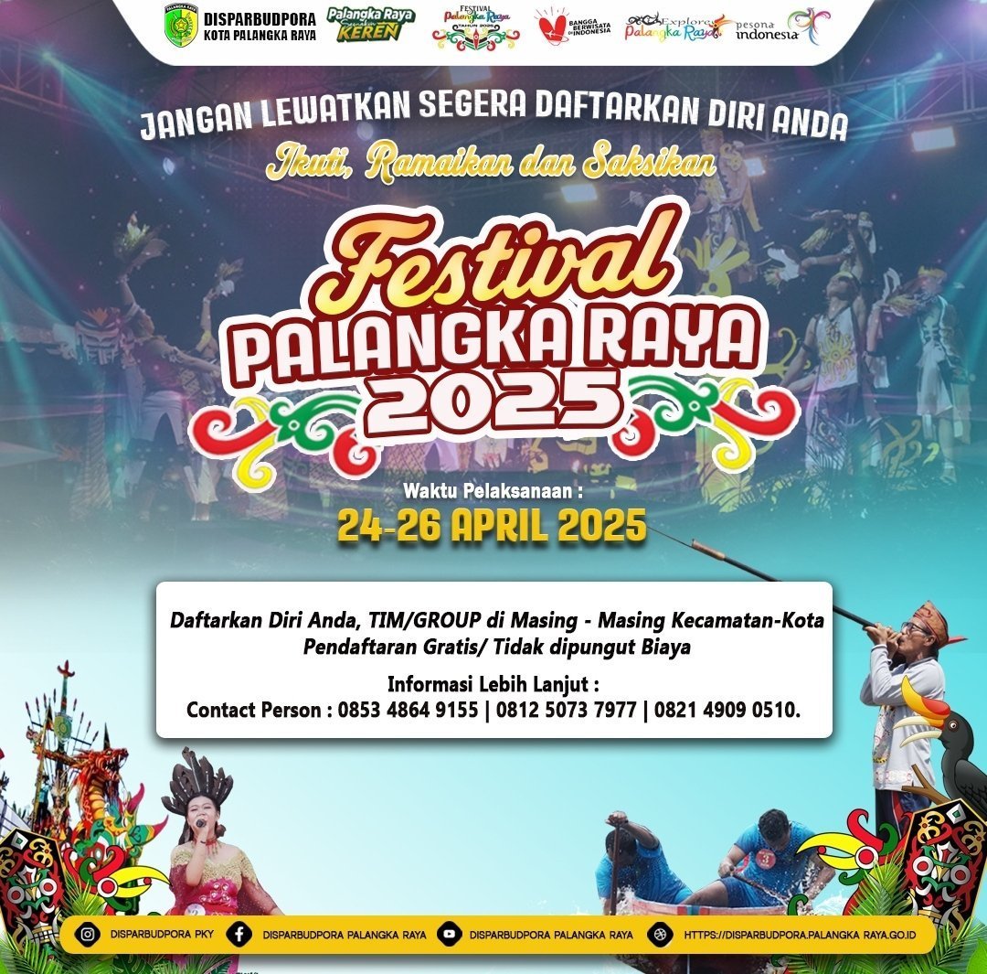 PALANGKA RAYA – layarkalteng.co.id, Pemerintah Kota Palangka Raya melalui Dinas Pariwisata, Kebudayaan, Kepemudaan, dan Olahraga (Disparbudpora) akan kembali menggelar Festival Palangka Raya pada 24 hingga 26 April 2025 mendatang. Agenda tahunan ini dirancang sebagai wadah ekspresi budaya, sportivitas, sekaligus promosi sektor pariwisata lokal.