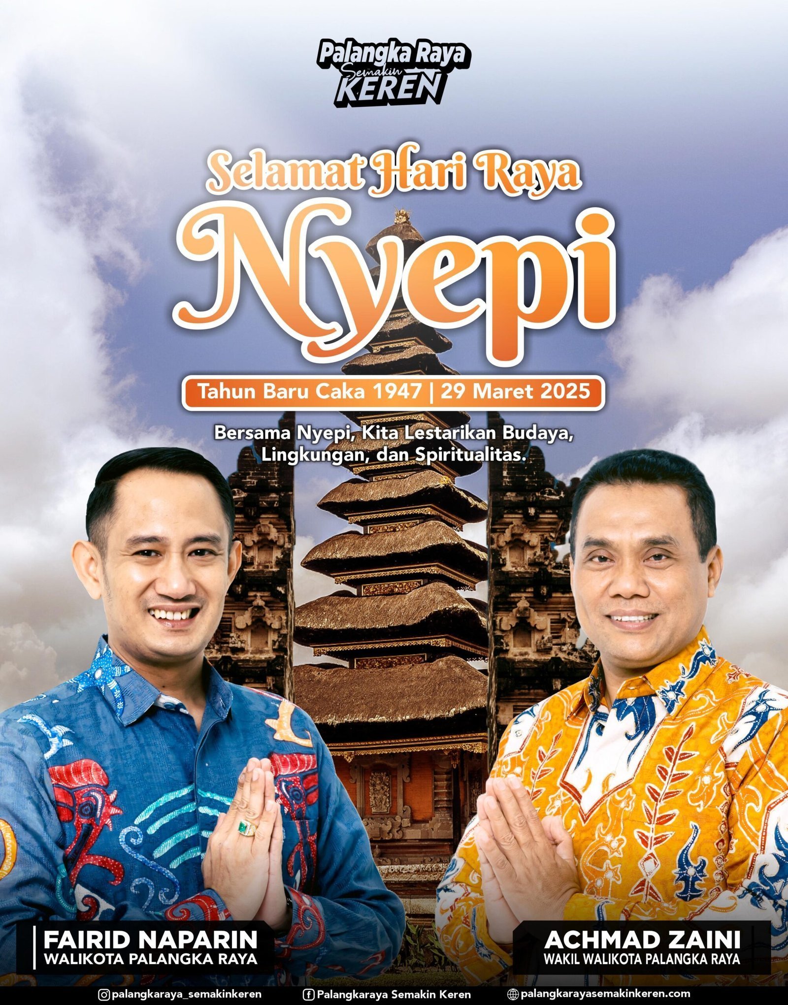 PALANGKA RAYA – layarkalteng.co.id, Wali Kota Palangka Raya Fairid Naparin dan Wakil Wali Kota Palangka Raya Achmad Zaini menyampaikan ucapan Selamat Hari Raya Nyepi Tahun Baru Caka 1947 kepada seluruh umat Hindu di Kota Palangka Raya.(28/2025)