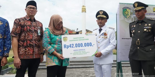 PALANGKA RAYA – layarkalteng.co.id, Dalam suasana penuh haru dan penghormatan, Wali Kota Palangka Raya, Fairid Naparin secara langsung menyerahkan santunan jaminan kematian kepada ahli waris almarhum Aron Arnold, Ketua Kelompok Penyelenggara Pemungutan Suara (KPPS) TPS 66 Kelurahan Menteng, Kecamatan Jekan Raya, yang wafat saat menjalankan tugas pada Pemilu lalu.